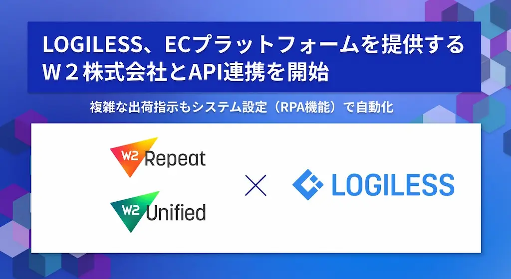 株式会社ロジレス(本社:東京都品川区、代表取締役:足立直之)が提供するEC自動出荷システム「LOGILESS」は、W2株式会社(本社:東京都中央区、代表取締役:山田大樹、以下W2)が展開するECプラットフォーム「W2 Unified」「W2 Repeat」と連携を開始したことをお知らせします。この連携により、W2のプラットフォームを利用するEC事業者様は、反復業務である受注・出荷・在庫管理の業務の自動化や複数拠点からの出荷が可能になります。