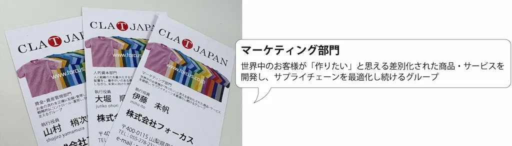 今回の組織改編に至った背景には、業務の内製化率が大きく上がったことが挙げられます。当社が運営するオリジナルグッズ製作・販売サイト「CLAT-JAPAN(読み:クラティージャパン)」は、これまで内製化率が約65%でした。しかし、コロナショック以降、徐々に自社工場で製作・販売できる環境を整えていき、今期に入って約90%と、内製化率が一気に上がりました。生産と販売のほとんどの工程を自社で行えるようになり、社内がより一体となっています。会社の成長速度に合わせて、その成長に見合うよう組織も急速に変えていかなければならないという思いで実施いたしました。