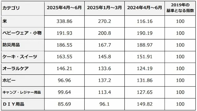 前期(1~3月)に「異常高騰」として突出した動きを見せた米は、今期もその上昇トレンドが全く衰えず、全カテゴリ中で最大の伸び率を記録しました。指数は300を超え、基準年である2019年からは+238.9%という水準に達しています。