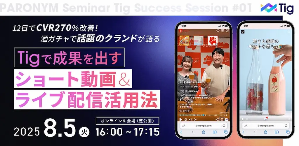 映像内のモノ・ヒト・コト・音・場所等に触れるだけで情報にアクセスできる、インタラクティブ動画技術「Tig(ティグ)」をベースとした各種映像ソリューションを提供し、「Re:design communication:伝えるを再定義する」を実現するパロニム株式会社(本社:東京都中央区、代表取締役:小林道生、以下「パロニム」「当社」)は、ライブコマースツール「Tig LIVE」および、スマートフォンだけでインタラクティブな縦型ショート動画を作成できる「Tig Short」を活用し、大きな成果を上げているオンライン酒屋「クランド」を運営するKURAND株式会社(本社:東京都足立区、代表取締役:荻原恭朗、以下「クランド」)をゲストに招いたセミナーを、2025年8月5日(火)16時からハイブリッド形式(オンライン+オフライン<東京・芝公園>)にて開催することをお知らせいたします。
