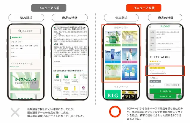 2.回遊性と購買意欲を高める機能導入:お悩みで探す検索軸やレコメンド機能の実装により、お客様が新たな商品と出会うきっかけを創出しました。