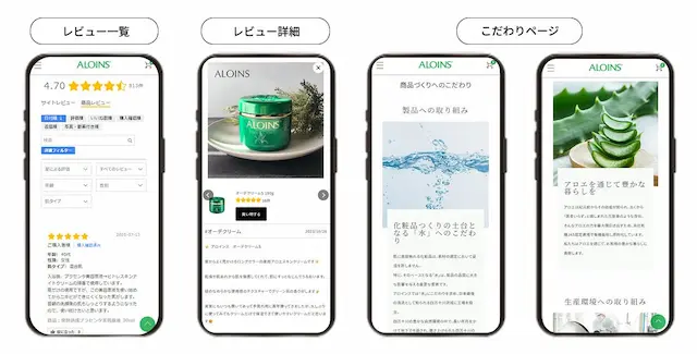 3.信頼を醸成するコンテンツ強化:外部レビューツール導入により、ほぼゼロだったレビューが800件以上に増加。企業の想いを伝える「こだわり」ページも新設しました。