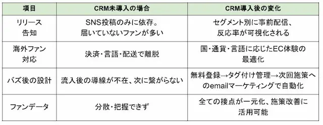 そこで必要なのが、CRM(Customer Relationship Management 顧客関係管理)という、自社で持てる唯一の“ファンとの直接接点”です。CRMがあることで、以下のようなファン体験が可能になります。