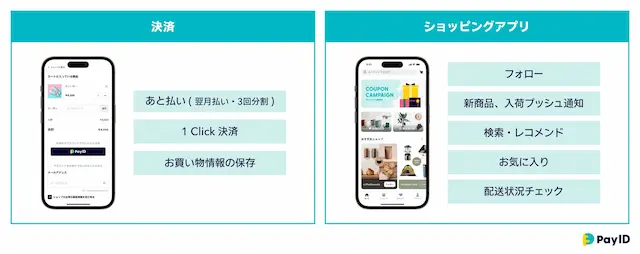 「Pay ID」は、ネットショッピングでのスムーズな決済体験と、新しい商品との出会いや好きなショップでのリピート購入をサポートする購入者向けショッピングサービスです。ID決済とショッピングアプリ(Pay IDアプリ)を提供しています。