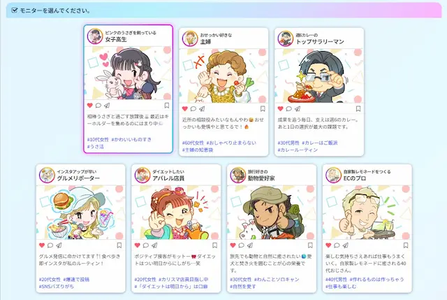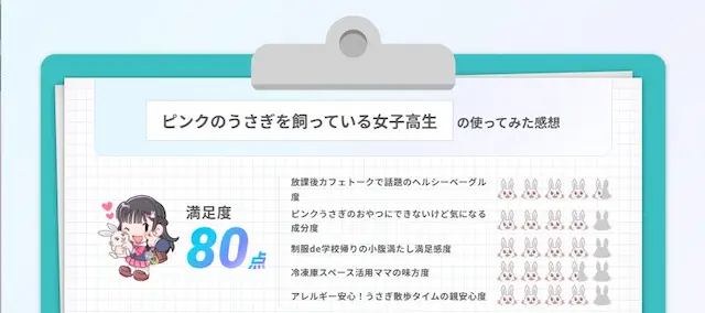 実際のモニター調査は費用や時間など膨大なコストがかかりますが、この新機能では擬人化AIによる簡単な擬似モニター調査を行うことができます。例えば、「ピンクのうさぎを飼っている女子高生」「おせっかい好きな主婦」など、様々な人物像で商品をモニタリングし、それぞれの視点によって項目別に評価します。