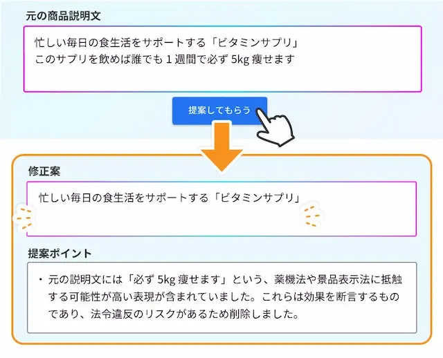 AIが既存の商品説明文を簡易的に確認し、誤字脱字の修正や、景品表示法・薬機法に抵触する可能性がある表現を注意喚起します。また、より分かりやすい表現への改善案を提示し、商品紹介文の品質向上もサポートします。