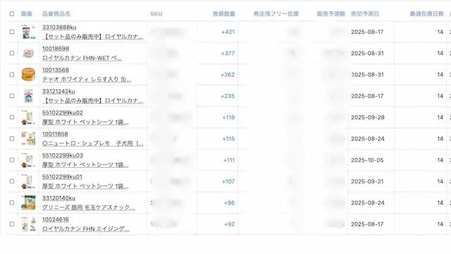 SKUごとの直近の販売数から販売予測を行い、現時点の在庫数と発注残の差分を推奨数量として表示するダッシュボードです。こちらのデータを見ながら発注数量を決定することで、Excelでの作業時間はゼロになりながら欠品を従来の10分の1に抑えていただけるようになりました。