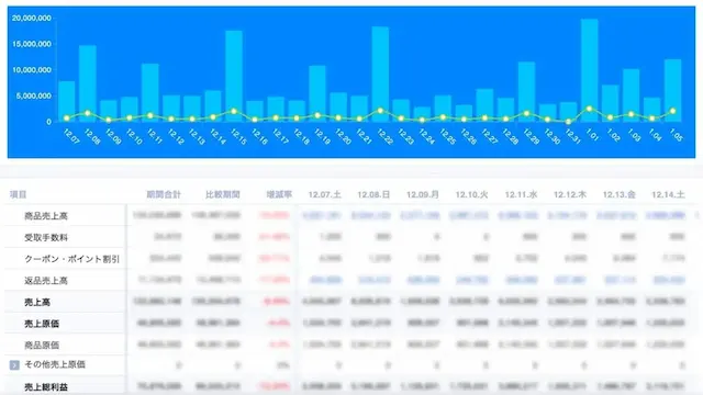 日次の売上、売上総利益、販売管理費から訪問者数、販売数、CVR、客単価、平均OFF率といった各種KPIの指定期間との比較が可能な限界利益のダッシュボードで日々の施策の効果検証を行っていただいております。ストアレコード導入前はExcelでの手作業で時間をかけて毎日集計していたものが、導入により毎朝一番にご確認いただけるようになりました。