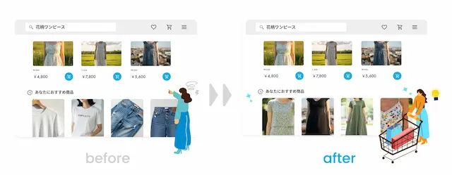 AIがAさんの花柄ワンピースの閲覧行動をリアルタイムで解析し、その商品のテキスト情報、色、形、素材といった特徴まで即座に把握します。その結果、Aさんが見ている花柄ワンピースと類似のワンピースや、同じ柄のトップスがサイト画面に表示され、別の商品を探す手間が省けます。これにより、最も関心が高い商品に素早くたどり着き、即座の購買につながります。