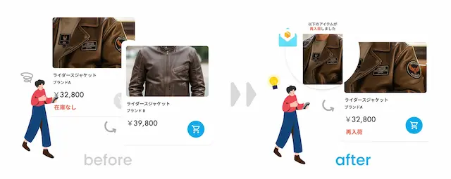 限定コラボのレザージャケットをカートに入れた顧客Cさん。しかし、商品が人気でわずか数時間で品切れに。Cさんは再入荷を知る由もなく興味を失い、結局競合他社で類似商品を購入してしまいます。結果として、ブランドは貴重な売上機会を失い、顧客を競合に奪われてしまいます。
