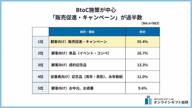 A. 1位は「販売促進・キャンペーン」で55.4%です。次いで「景品(イベント・コンペ)」26.7%、「成約記念品」13.3%となっており、顧客や取引先へのギフトの目的での利用が多くなっています。一方、従業員向けのギフトとしての利用も11.0%あり、企業によっては従業員の帰属意識の向上のためにソーシャルギフトを活用しているケースもあります。