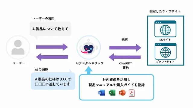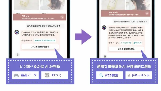 本機能により、『AIデジタルスタッフ』は自社ECの商品情報やカタログ等のオフライン情報と連携することができ、AI機能がその情報をもとに自律的に判断・行動し、質の高い接客を実現してユーザー体験を向上させます。