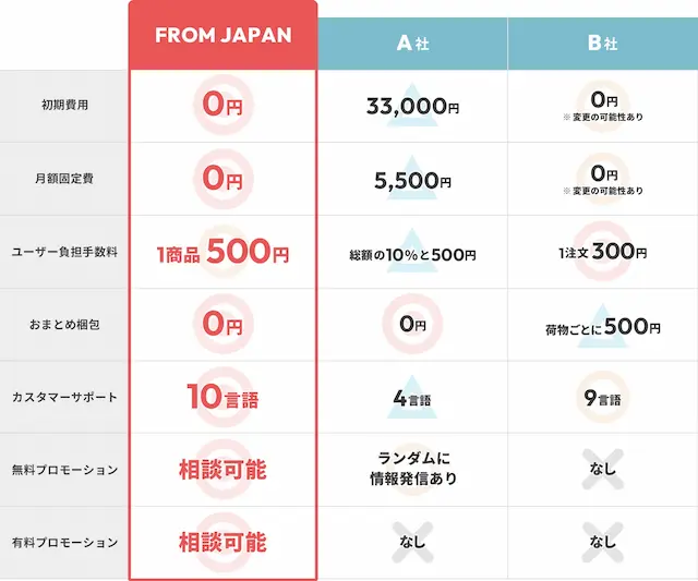 貴社上のキャンペーン等特典の適用も可能です!ただの販路拡大だけでなく、よりビジネス面での訴求ができるよう自由にカスタマイズしてご利用ください。また、ご希望があればFROM JAPANのマーケティングチームが販促訴求のご提案も行います。お気軽にご相談ください。