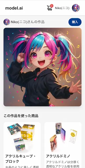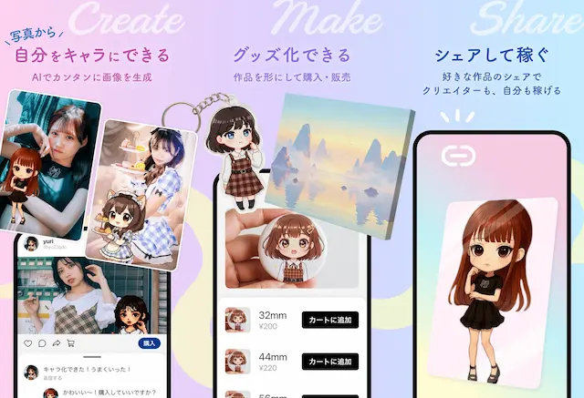 まず、キャラクターやアートを生成すると自動でグッズ化。そのまま自社サービス上で販売が可能になりました。購入履歴はすべてIDで紐づいており、クリエイターに利益を還元する仕組みを採用しております。また、作品をシェアし、購入につなげたユーザーにも報酬が届く「動的なEC機能」を新たに搭載し、クリエイターとファン、シェアした人すべてが利益を得られる設計へと進化しました。