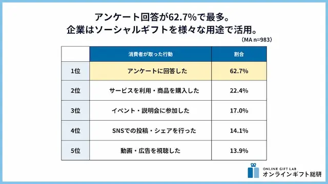 企業からソーシャルギフトを受け取るために消費者が取った行動は、「アンケートに回答した」が62.7%で最も多く、次いで「サービスを利用・商品を購入した」が22.4%、「イベント・説明会に参加した」が17.0%となりました。