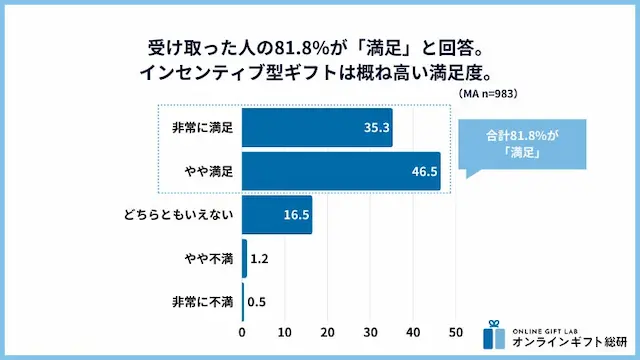 さらに、これらのインセンティブ型ビジネスギフトを受け取った消費者の81.8%が満足(非常に満足+やや満足)と回答しており、企業活動のインセンティブとしてソーシャルギフトが消費者側にも概ね好意的に受け止められている結果となりました。