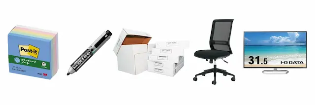 - オフィス向け事務用品:付箋、マーカー、コピー用紙、オフィスチェア、モニターなど