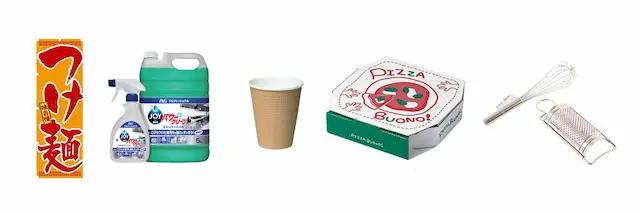 - 飲食店向け用品:のぼり旗、洗剤、テイクアウト用容器、調理器具など