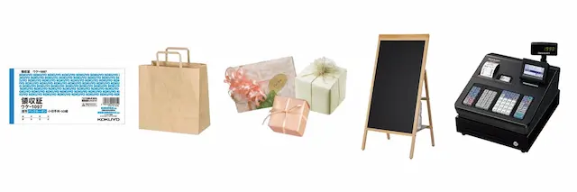 - 小売店・アパレル向け用品:伝票用紙、袋類、ラッピング用品、POP用品、電子レジスターなど