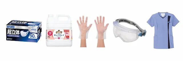 - クリニック・サロン向け衛生用品:マスク、消毒液、手袋、防護グラス、スクラブなど
