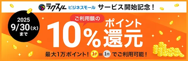 サービス開始を記念し、2025年9月30日(火)まで、「ラクスルビジネスモール」のご利用額の10%をポイント還元いたします。ポイントは、「1ポイント=1円」でご利用いただけます。