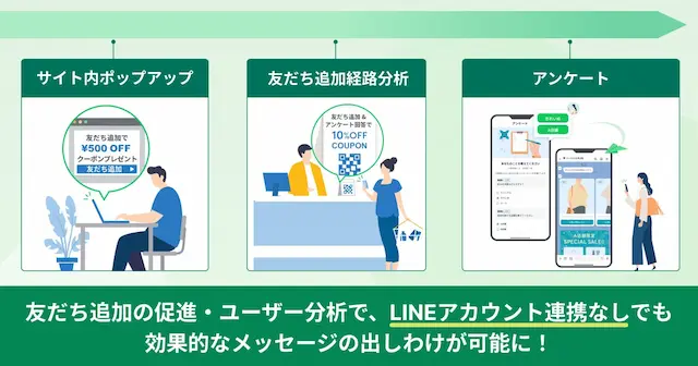 - 友だち追加経路機能やアンケート機能を活用し、ユーザー特性に合わせたメッセージの出しわけを、LINEアカウント連携なしでも実現できます。