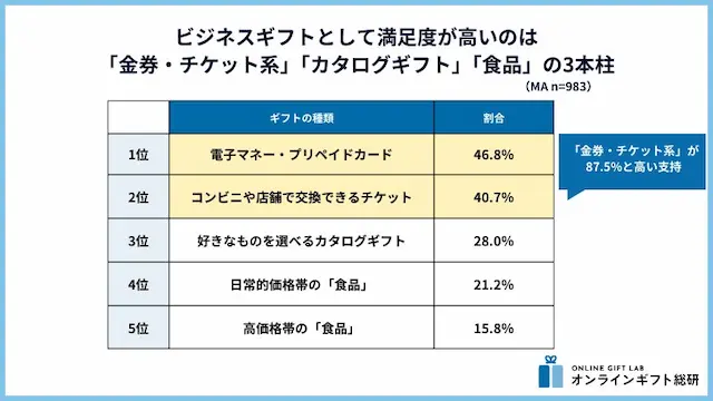 1.ビジネスギフトとして満足度が高いのは「金券・チケット系」「カタログギフト」「食品」の3本柱