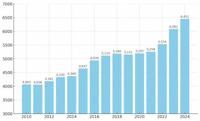 日本アイスクリーム協会によると、2024年のアイスクリーム販売金額(メーカー出荷ベース)は前年比6.1%増の6,451億円、販売物量は前年比3.1%の935,916kLでした。販売金額は5年連続で過去最高、販売物量は歴代2番目となります。また、一世帯当たりの年間支出金額も前年比6.2%増の12,295円と過去最高で、5年連続1万円超を記録しています。消費量・支出ともに増加傾向にあることから、この増加は物価高による食品価格高騰の影響だけでなく、実際にアイスクリームを食べる量自体が増えていることを示しています。