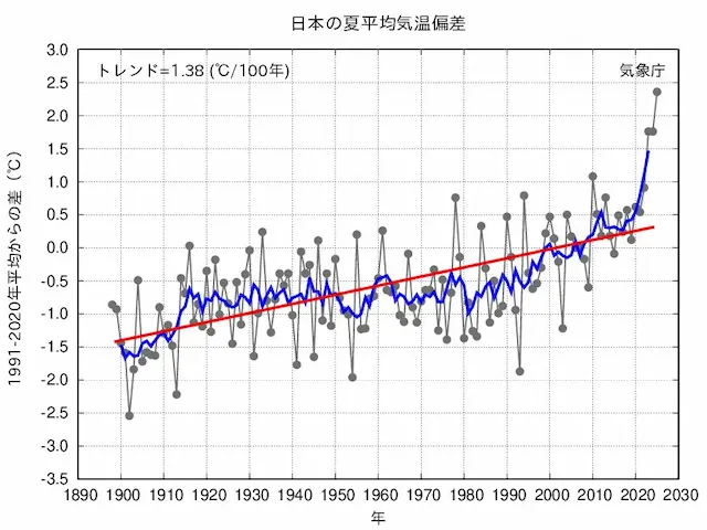 参照: 気象庁「日本の夏(6~8月)平均気温偏差の経年変化(1898~2025年)」 https://www.data.jma.go.jp/cpdinfo/temp/sum_jpn.html