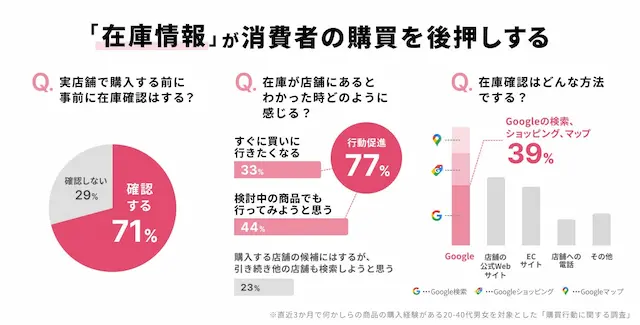 近年、消費者は購入前に商品の在庫情報を確認する行動が一般化しています。movが実施した『在庫情報が購買行動に与える影響度の調査』によれば、実店舗で購入前に商品在庫を確認するユーザーは71%、在庫が店舗にあると行動が促進されるユーザーは77%にのぼりました。また、在庫確認の方法としてGoogle検索・Googleショッピング・Googleマップのいずれかを利用する割合(39%)は、自社サイトやECサイトを上回ることがわかりました。こうした購買行動に対応するため、movは「ローカルインベントリマーケティング」という新しいマーケティング手法を提唱し、その実現を支援するサービスの第一弾として「ライトOMOサービス」の提供を開始します。