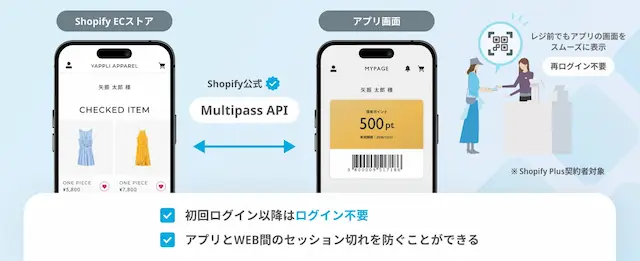 今回の連携強化により、Shopify公式が推奨する安全な認証方式(Multipass API)を使用し、追加開発なしで実現できるようになりました。これにより、アプリで一度ログインをすれば、アプリ内でECサイトを閲覧する際に、ユーザーの再ログインは不要となり、ログイン状態が保てます。ECサイトへのアクセスやレジ前での会員表示がスピーディになることで、ストレスのない購買体験を実現します。(※)