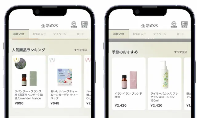 ECサイトに掲載されている商品データやブログ記事を、アプリ内で自動的に最新情報として表示できるようになりました。株式会社生活の木が運営する「生活の木公式アプリ」では「人気商品ランキング」「季節のおすすめ」といった、ECサイト上の商品表示をアプリ上でも実現しています。これにより、ユーザーはWEBに遷移することなく商品情報を閲覧可能に。さらに、ECとアプリのコンテンツを一元的に更新できるため、運用負荷の軽減も期待できます。