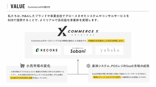 CommerceX HDは、グループとしての経営資源を一元化し、クラウド基幹システム「RECORE」を中心としたテクノロジー基盤、そばにが培ってきたEC・デジタルマーケティングの知見、株式会社ユハクをはじめとするブランド事業の運営ノウハウを融合させることで、従来の小売・リユースの枠を超えた新たな商流を実現してまいります。