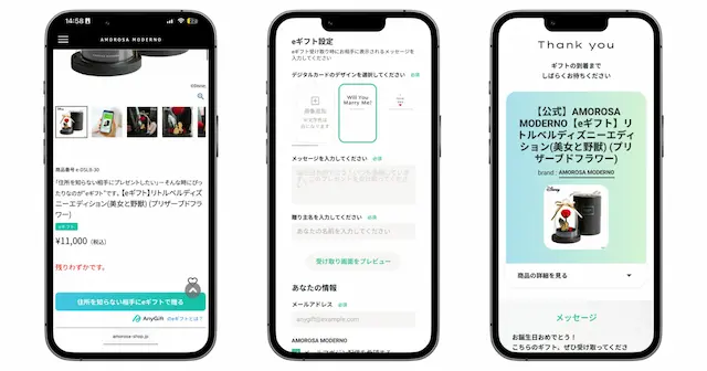 AnyGiftは、相手の住所を知らなくてもLINEやメールで贈ることができる"eギフト機能”をECサイトに組み込むことができるサービスです。この提供により、「AMOROSA MODERNO公式オンラインストア」の人気商品がeギフトとして贈れるようになります。