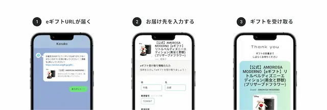 eギフトURLから住所を入力いただくだけで対象商品が配送されます。受け取りに会員登録は不要で、登録した住所が贈り主に伝わる心配もありません。