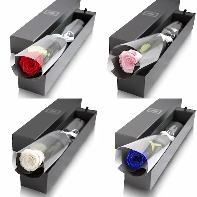 4つのカラーから1つお選びいただけます。「The ONE(ザ・ワン)」とは、英語で「ただひとりの大切な人」という意味。黒のロングボックスを開けると、天然ダイヤモンドとラメが煌めく大輪のバラが現れ、その輝きが特別な瞬間を永遠の思い出に変えます。