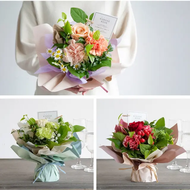 8つのカラーから1つお選びいただけます。生花の花束の中に1輪、大輪のプリザーブドローズを忍ばせました。生花が枯れた後、ローズだけを取り出し、ほんのり香るサシェに「きせかえ」ます。「きせかえローズ」は8つのカラーから1つお選びいただけます。