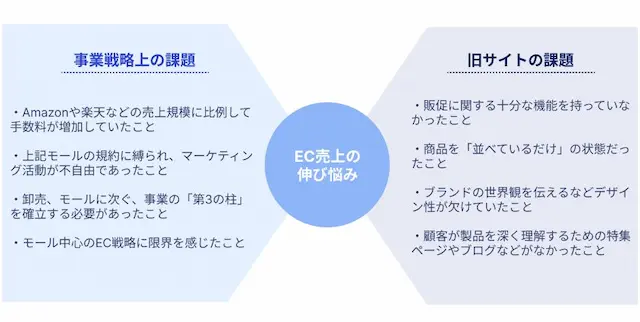 Amazonや楽天など大手プラットフォームへの依存は、手数料の増大や規約変更のリスクなど、多くの中堅企業が直面する経営課題です。テクタイト株式会社様も手数料の問題から自社ECサイトの確立が急務でしたが、旧サイトは機能やコンテンツ不足から売上が伸び悩んでいました。