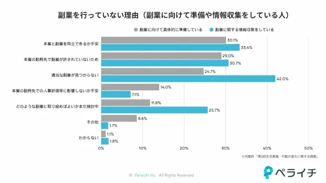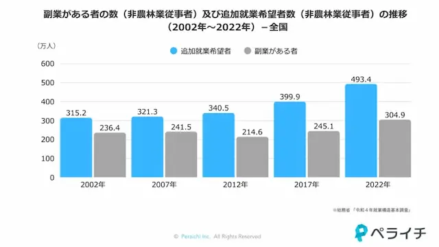株式会社ペライチ(本社:東京都港区 代表取締役CEO:藤本旬)は、総務省「令和4年就業構造基本調査」と内閣府「令和5年度 年次経済財政報告」等の政府統計を横断し再集計したところ、副業をしたい人(副業潜在層)493万人に対して、実際に副業をしている人は305万人にとどまり、依然として大きなギャップが存在することが明らかになりました。副業に踏み出せない最大の理由は「適当な副業が見つからない」(42%)ですが、その背景には、企業の制度的な壁だけでなく、「自分に合う仕事がわからない」や「できる気がしない」といった個人の自信の欠如、すなわち「心理的な壁」が大きく影響していることが判明しました。ペライチは、この課題解決のキーワードが、個人の強み発見から実践までをサポートする「伴走」にあると分析します。
