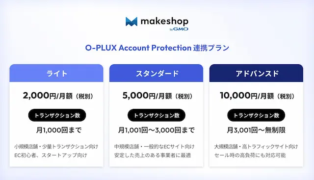 「makeshop byGMO」の特別価格として、通常、30万円ほどかかる導入費用を無料で提供します。また、ECサイトのビジネス規模やトランザクションに合わせて3つのプランを用意しています。ライトプランでは月額2,000円(税別)という、EC構築SaaS業界の不正検知対策では、業界最安価格で利用可能となります。