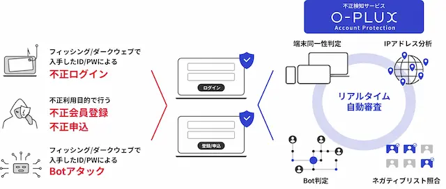 Caccoが提供する不正検知サービス「O-PLUX Account Protection」は、「ログイン画面」「登録/申込画面」での「不正ログイン」「不正会員登録」「Botアタック」を検知するクラウドサービスです。
