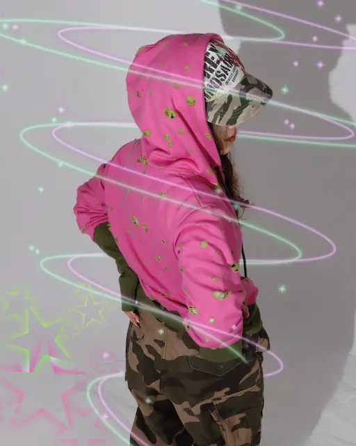 ピンクをテーマカラーとした海外ガールファッションを通じて遊び心や個性の解放を感じて貰えるような女の子のメイクルームがコンセプト。全てのアイテムに大きなプリントをあしらっていて、Tシャツ、スウェットパンツ、ナップサック、サングラスを販売予定。