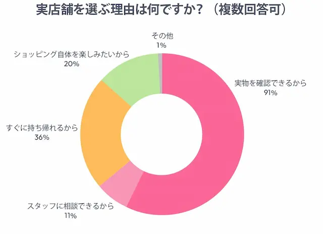 「実店舗が多い」「どちらも同じくらい」と回答した計75%に対して、実店舗を選ぶ理由についてもアンケート調査を実施した結果、「実物を確認できるから」(91%)が圧倒的多数を占めました。次いで「すぐに持ち帰れる」(36%)、「ショッピングを楽しみたい」(20%)と続き、“買うまでのプロセスを体験として楽しむ”人が多いことが分かりました。