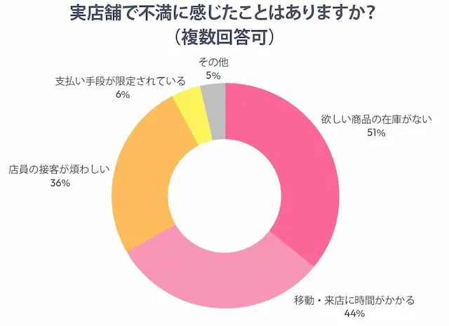 一方で、実店舗での購入における課題としては、「欲しい商品の在庫がない」(51%)、「来店に時間がかかる」(44%)など、利便性の面での課題も見られました。