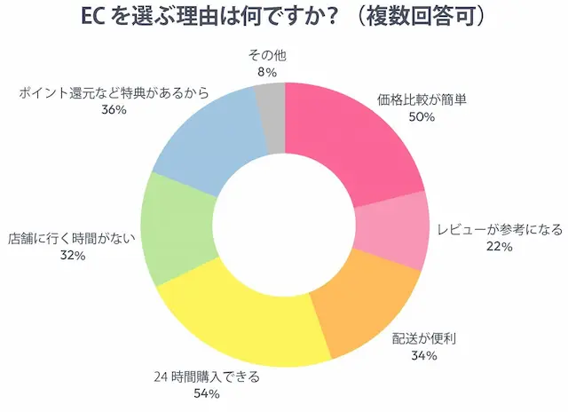 「ECが多い」「どちらも同じくらい」と回答した計35%に対して、ECを選ぶ理由についても調査しました。最も多かったのは「24時間購入できる」(54%)、次いで「価格比較が簡単」(50%)、「ポイント還元など特典がある」(36%)という結果でした。“時間にも価格にも縛られない自由さ”がECの魅力となっています。