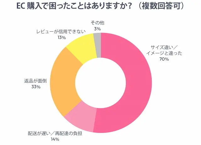 一方で、EC購入で困ったこととしては、「サイズやイメージの違い」(70%)、「返品の手間」(33%)など、実物を確認できない不安も残っています。