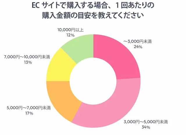 ECでの1回あたりの購入金額は「3,000~5,000円未満」(34%)が最も多く、「3,000円未満」(24%)を合わせると、半数以上が5,000円未満での利用でした。多くの人が“気軽に買える価格帯”でECを利用しており、「まず試してみる」購買行動が定着しつつあるようです。