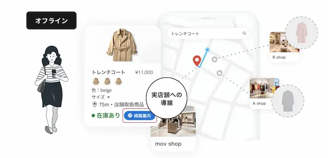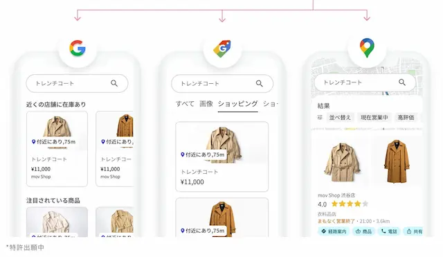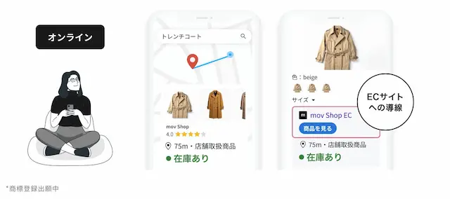 「ローカルインベントリマーケティング」は、movが小売業界向けに提唱する新しいマーケティング手法です。ユーザーが商品を検索した際に、その商品を扱う近隣店舗の在庫情報や店舗情報、さらにはECサイトへの購入導線をGoogleなどの検索プラットフォームに表示させます。これにより、実店舗への来店を促進するとともに、自社ECサイトへの購入導線も確立することで、オンラインとオフラインの双方でユーザーにスムーズな購買体験を提供します。