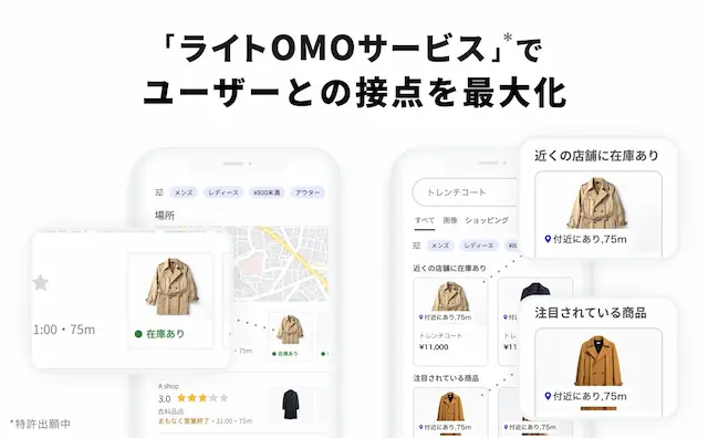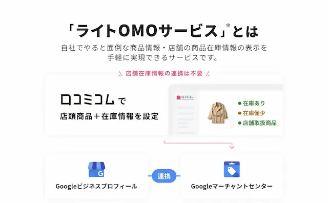 こうした変化の中で注目を集めているのが、movが提唱する「商品在庫情報」×「店舗情報」を活用して店舗・EC送客を最大化する新たなマーケティング手法──「ローカルインベントリマーケティング」です。movでは、小売企業がこの手法を手軽に導入できるよう、「口コミコム」のオプションサービスとして『ライトOMOサービス』を提供しています。