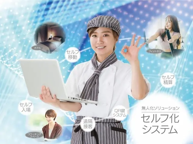 自遊空間において人件費の約30〜75%を削減できた実績を持つソリューションをパッケージ化した商品です。無人入会システム、セルフ入場システム、電子鍵での入室管理(QR鍵システム)、セルフ移動システム、セルフ精算システム、清掃解除システム、リモート接客システムを組み合わせ、ネットカフェやカラオケなど店舗の運用を革新します。